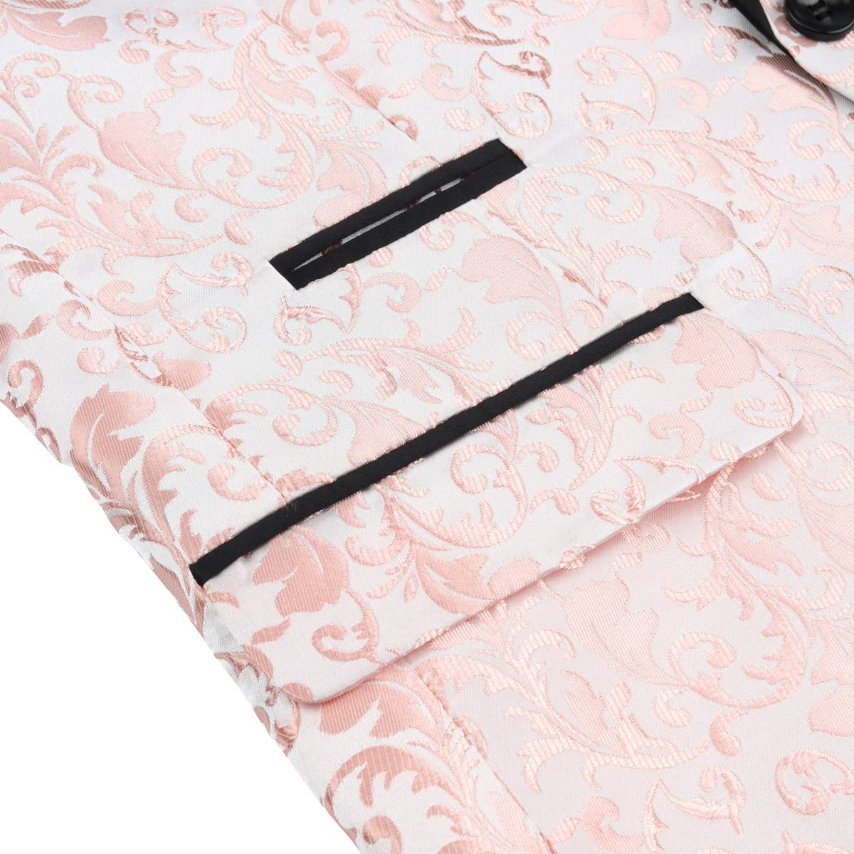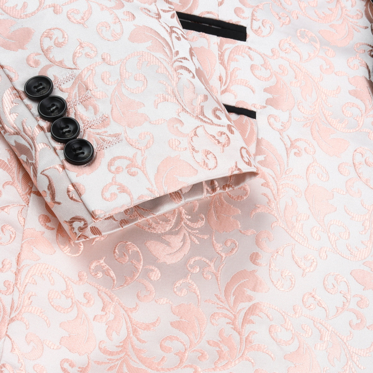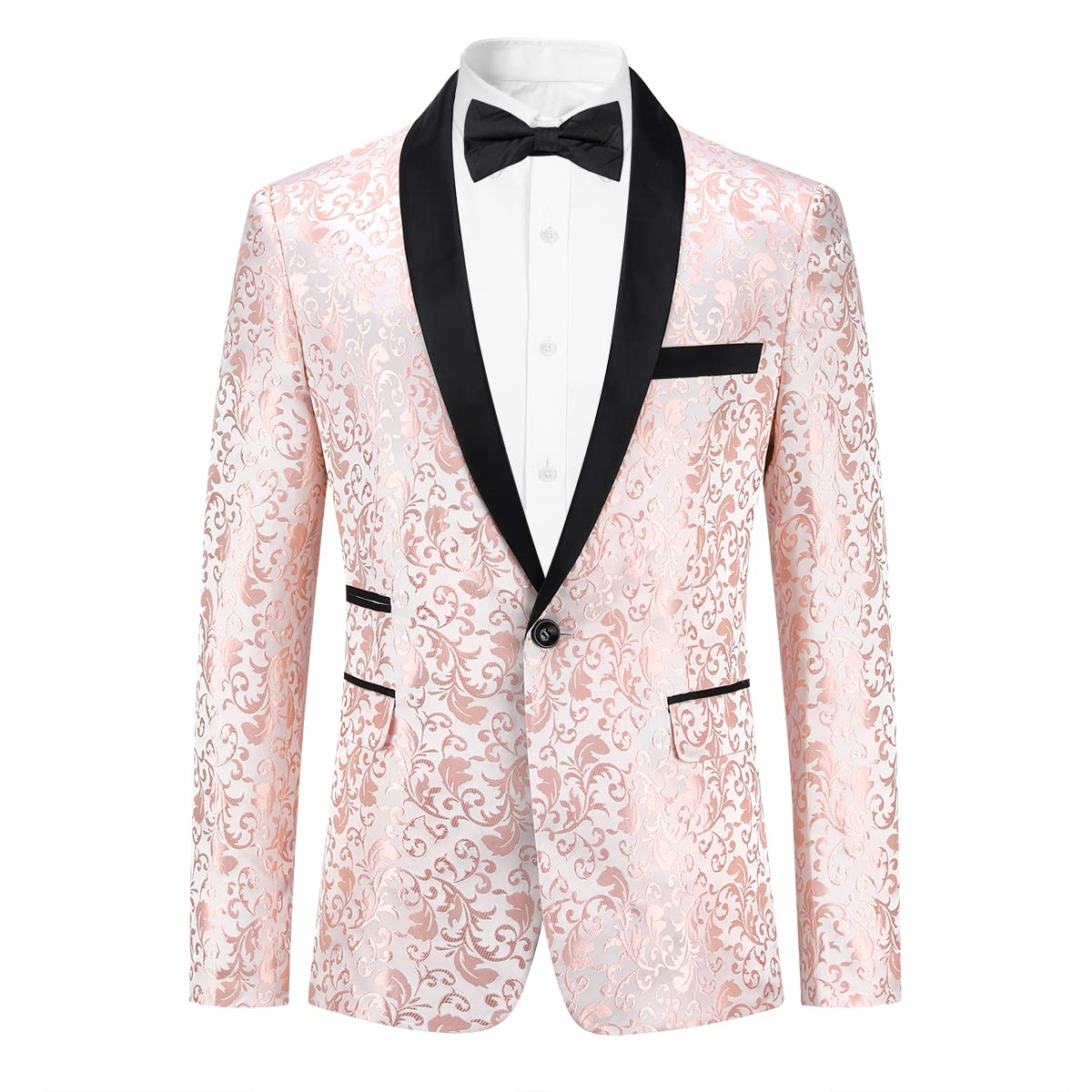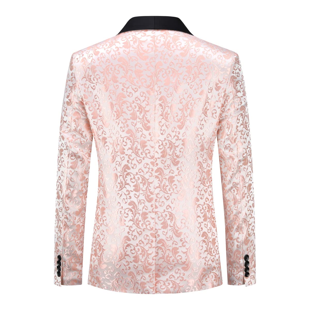This elegant suit blazer with black shawl collar, center vent, one chest pocket, two inner pockets and two side flap pockets; Featuring exquisite floral print; 3D tailored fit cut and full shoulder design, overall nice expressing a sharp looking.