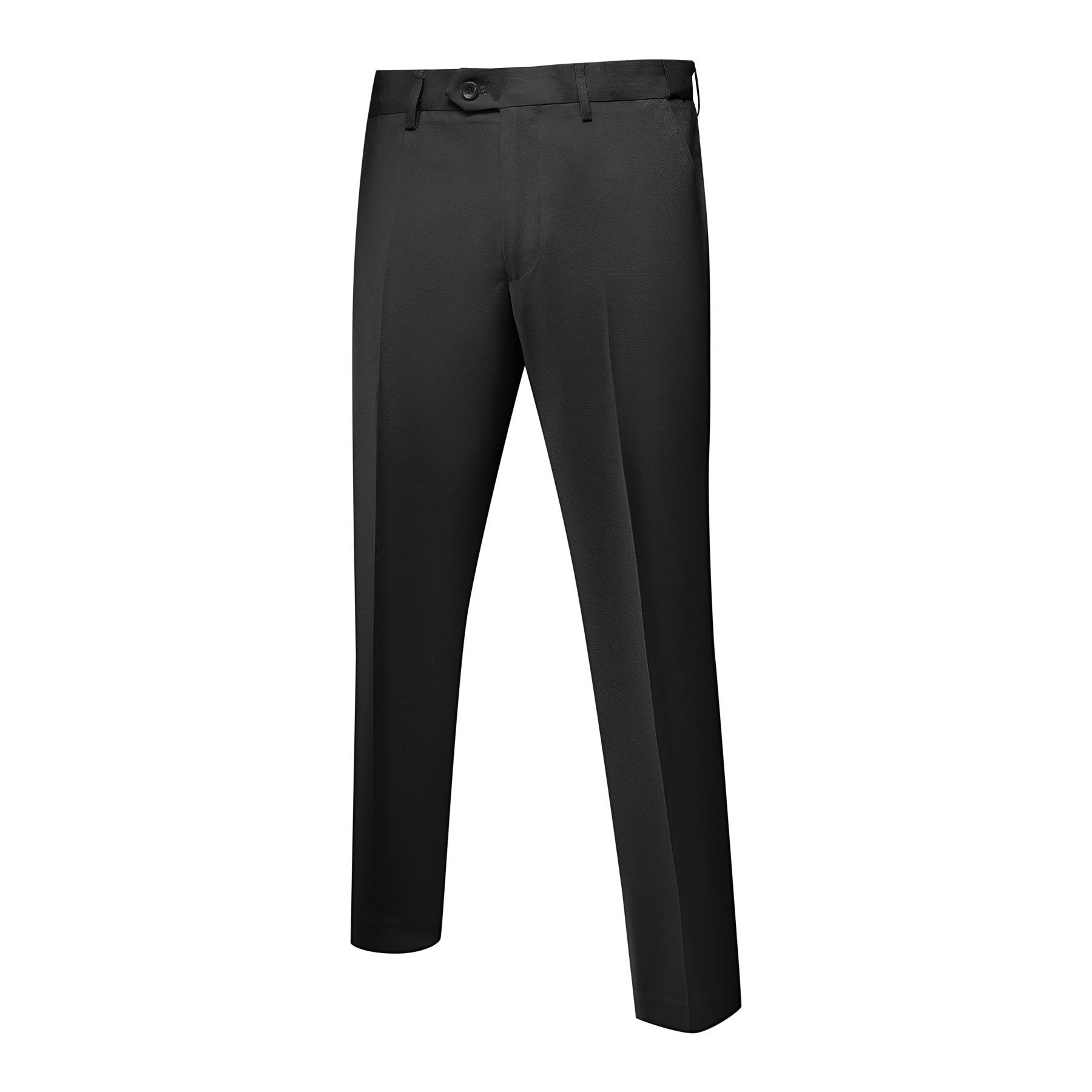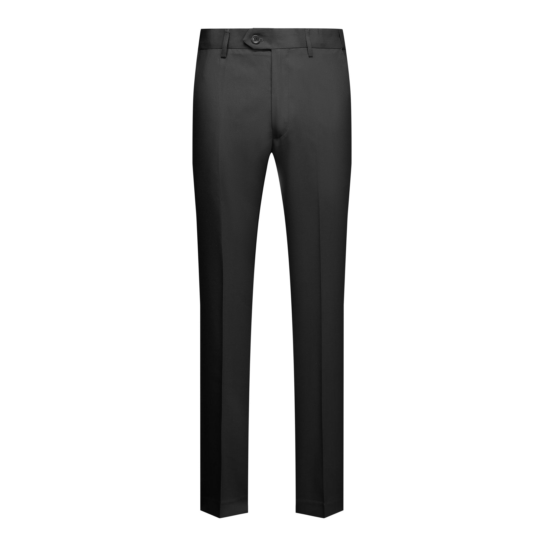 Flat front free length pants with an extended waist strap, slanted side pockets.