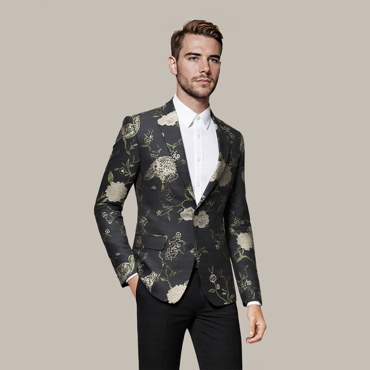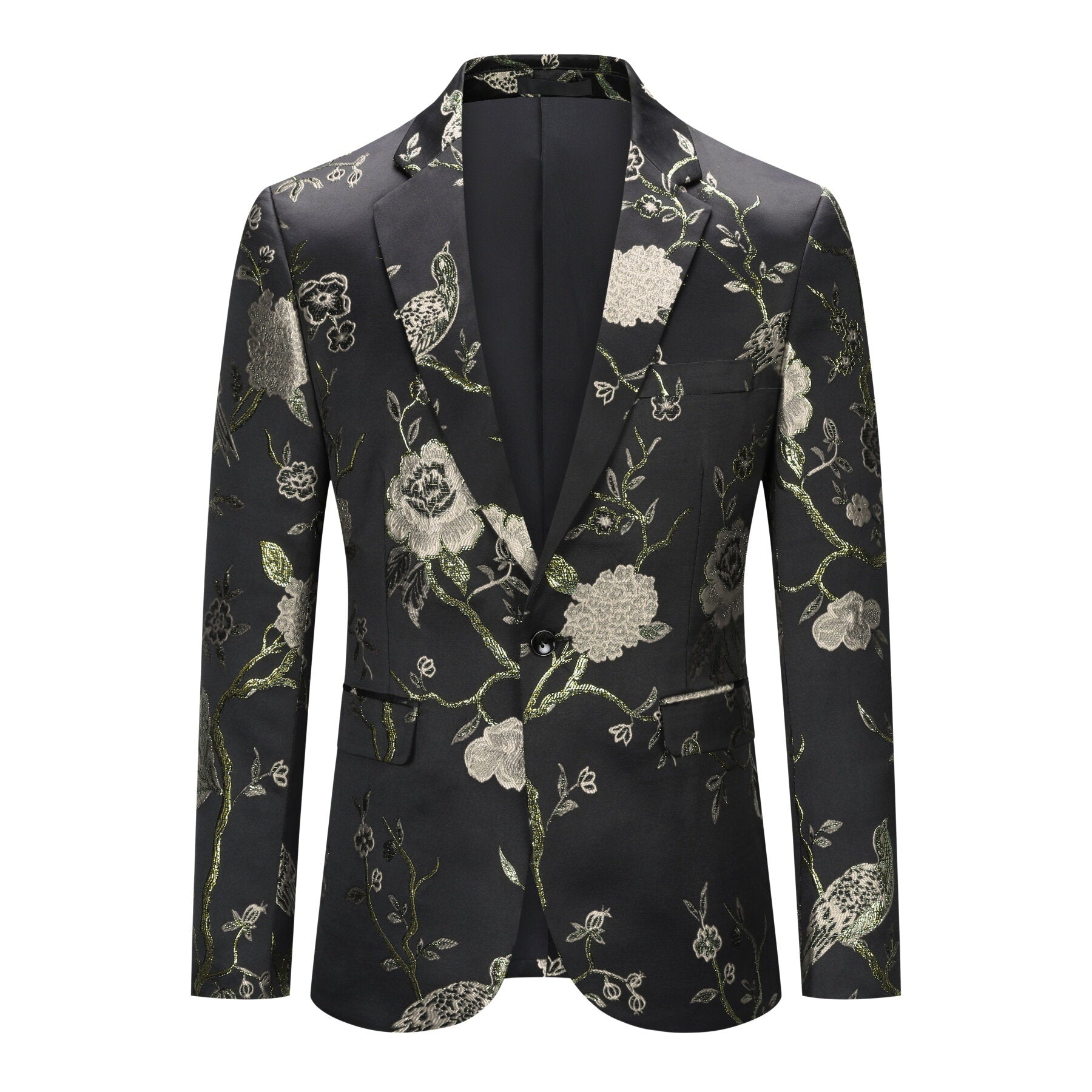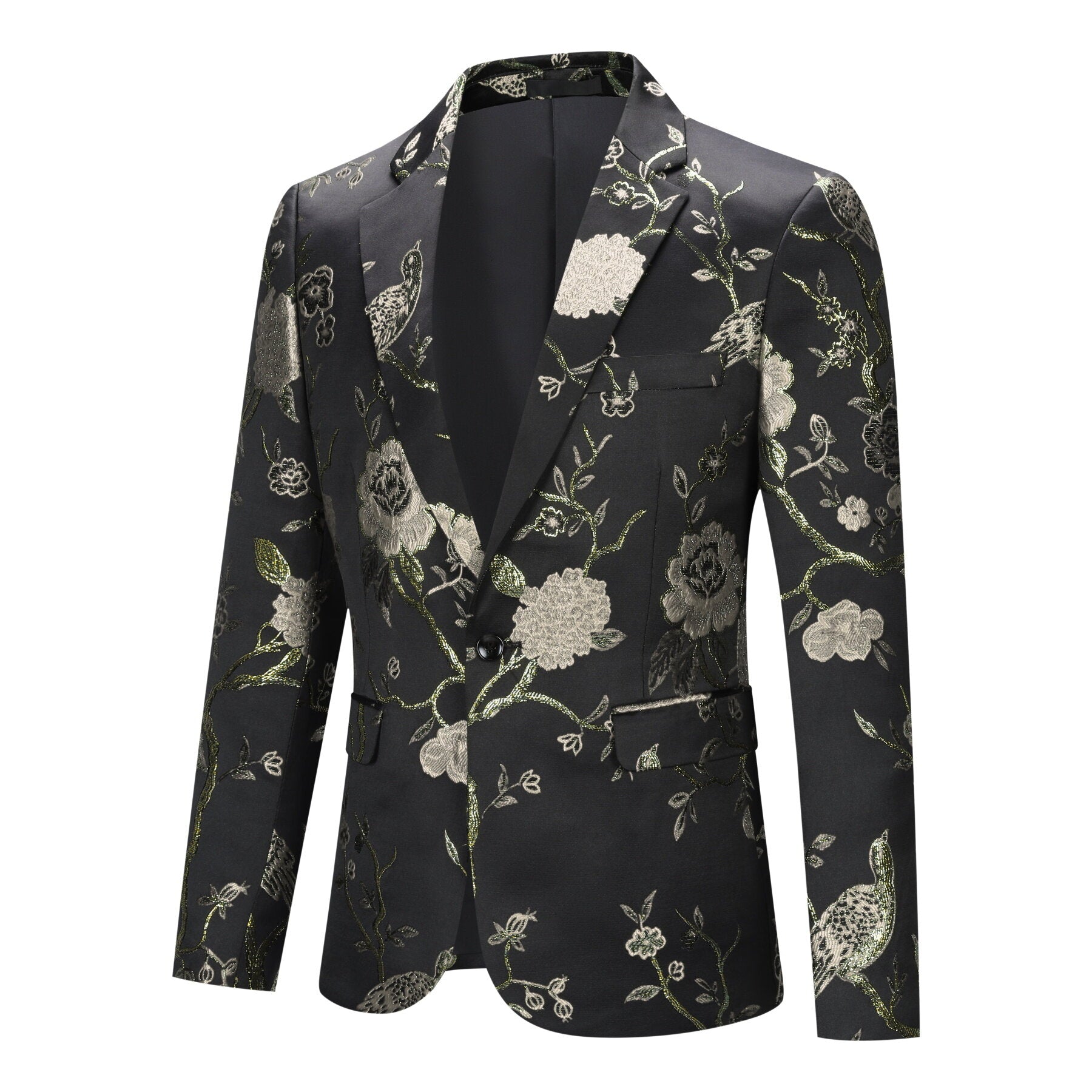 Men's One Button Notched Lapel Embroidered Blazer Silver