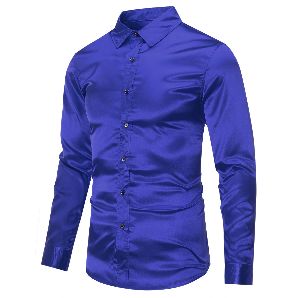 Men's Casual Fashion Shiny Long Sleeve Lapel Shirt Blue