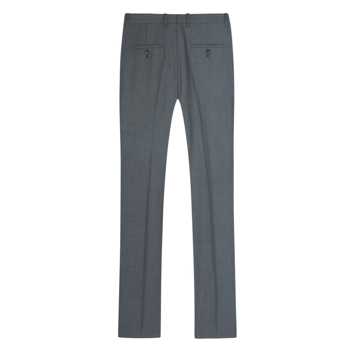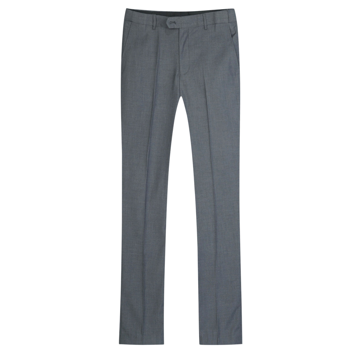Flat front free length pants with extended waist strap, slanted side pockets.