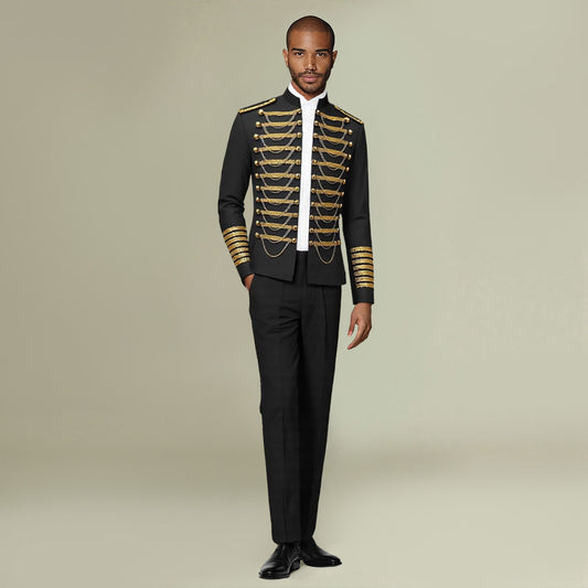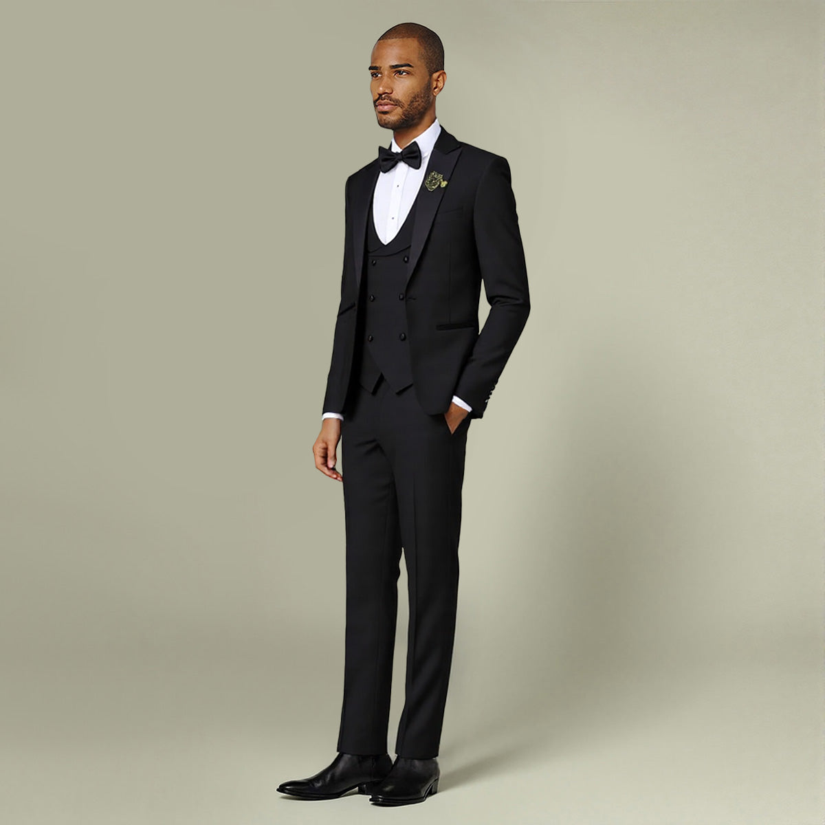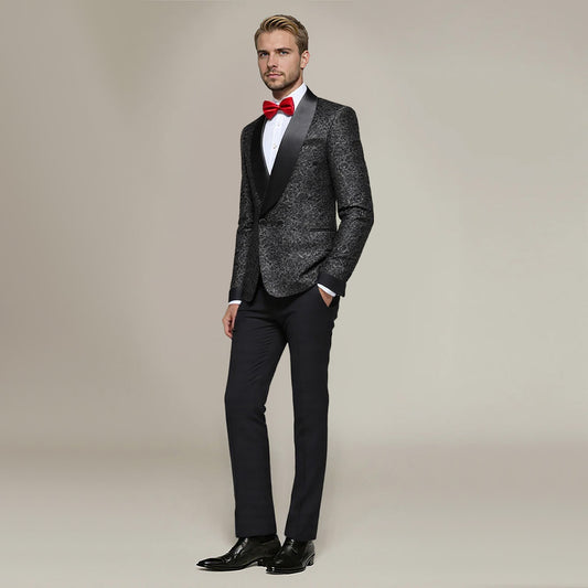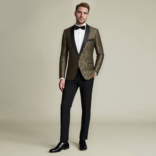 Slim fit, peaked lapel, button closure, combined classic suit culture with modern element