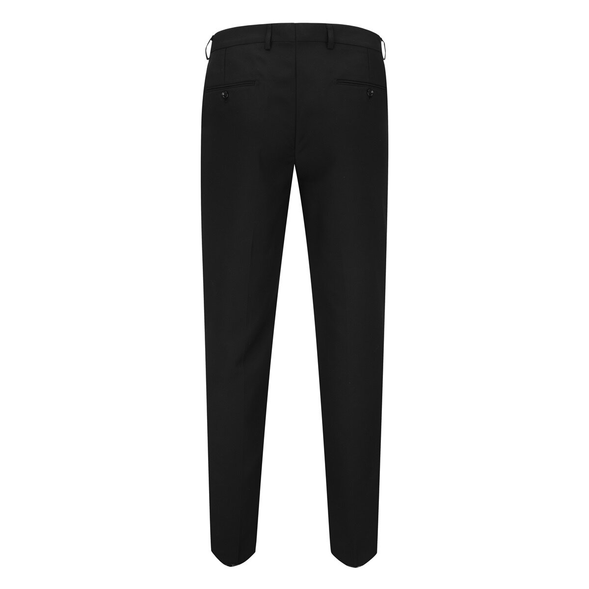 Flat front free length pants with extended waist strap, slanted side pockets