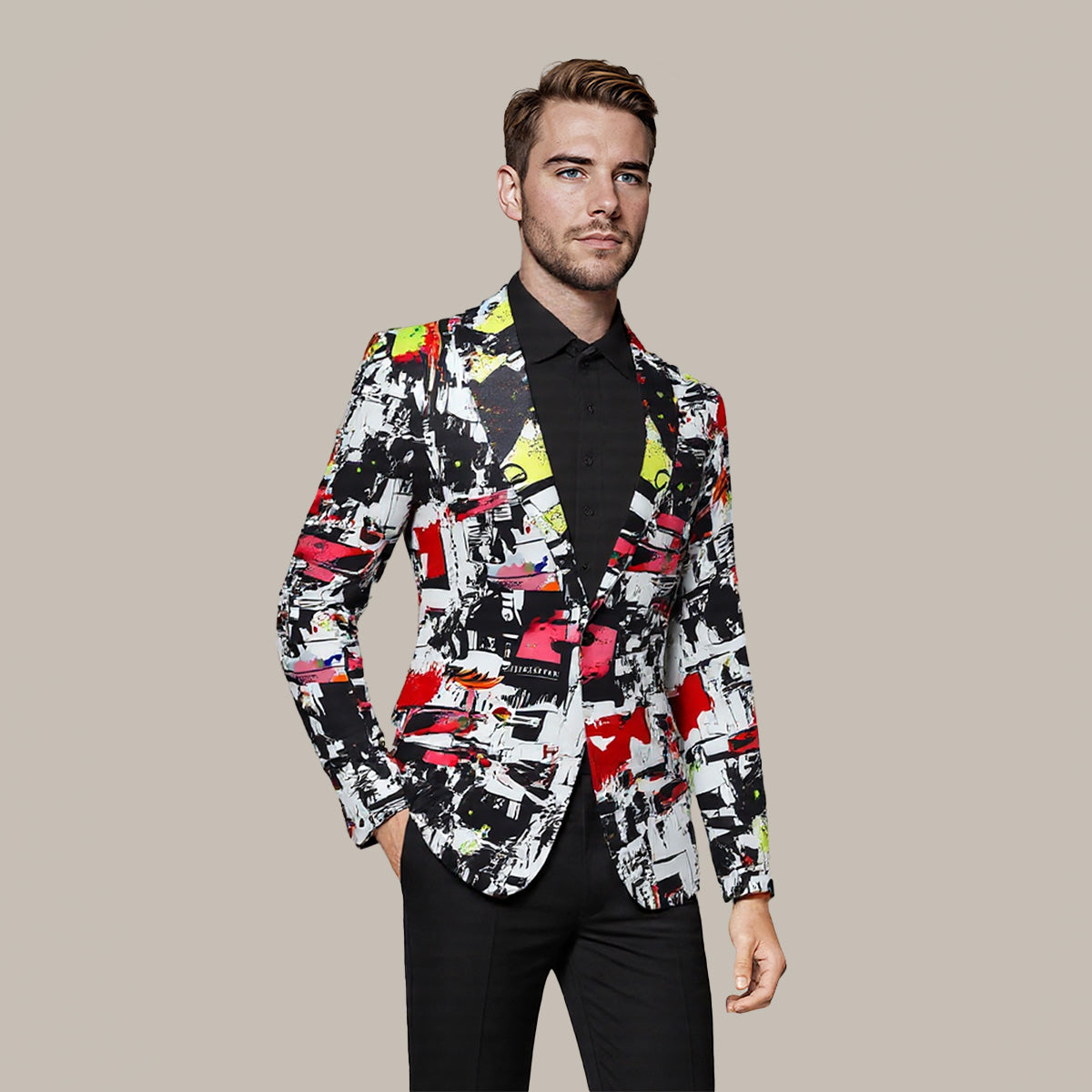 Single-breasted, One Button, Notched Lapel, Fashionable Random Cutting, Printed Patterns Design.